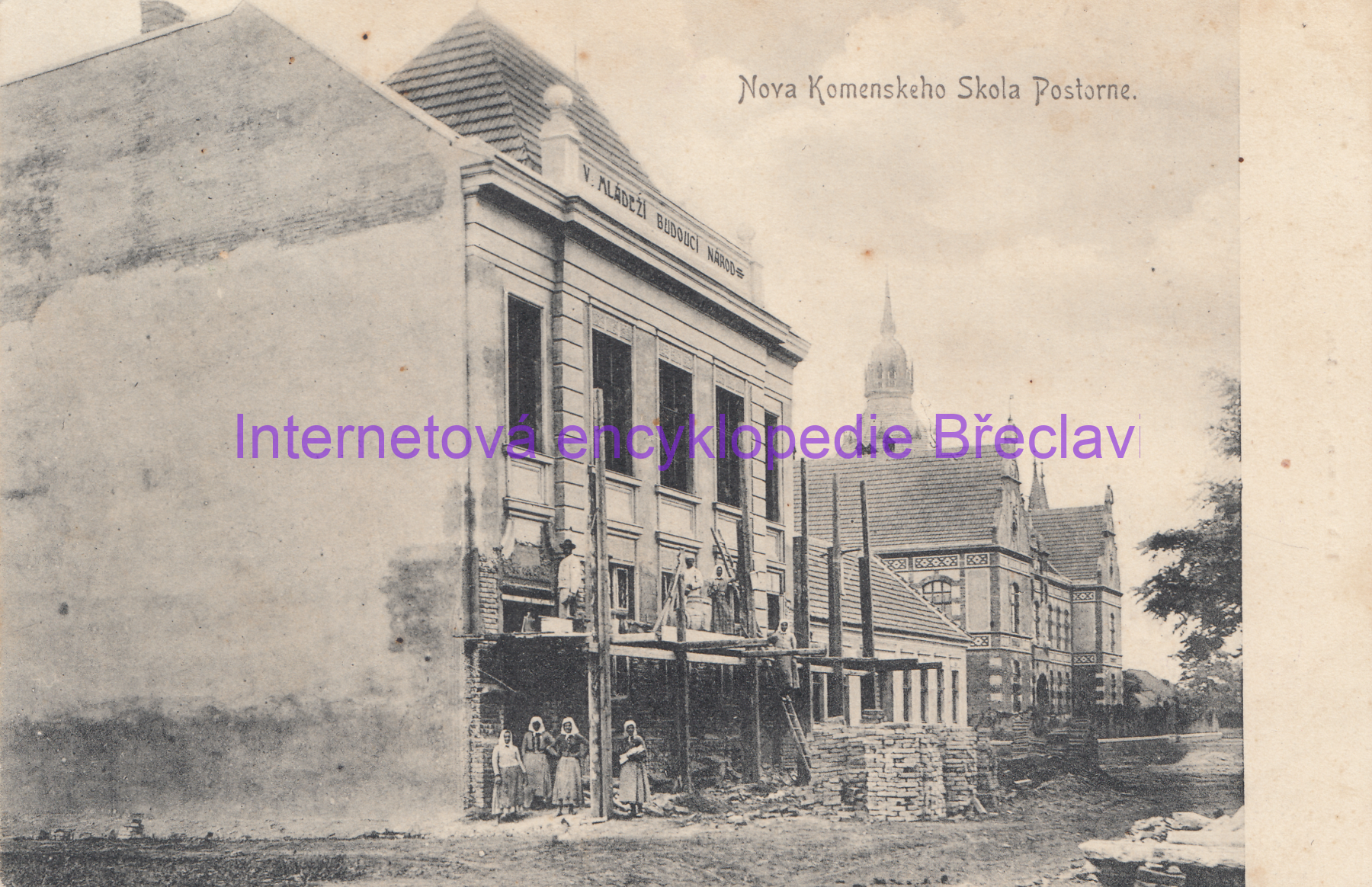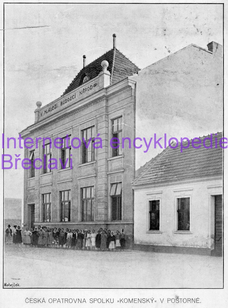 Někdejší školní budovu v Komenského ulici v místní části Poštorná v Břeclavi postavil roku 1909 vídeňský spolek Komenský. Stavbu za 50 000 K provedl poštorenský stavitel Němeček. Dům byl dokončen na podzim roku 1909 a měl sloužit jako opatrovna, tj. mateřská školka. Ještě před úředním schválením spolek Komenský pronajal dvě místnosti místním občanům, kteří zde zřídili ohřívárnu a útulnu pro žáky poštorenských škol.